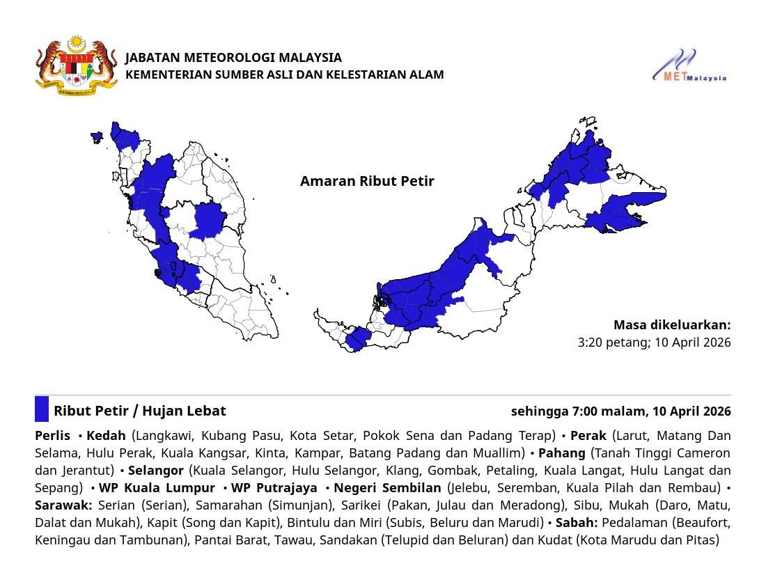 SHAH ALAM, 10 APRIL: Jabatan Meteorologi Malaysia (MetMalaysia) mengeluarkan amaran ribut petir, hujan lebat dan angin kencang di kebanyakan negeri sehingga jam 7 malam ini.