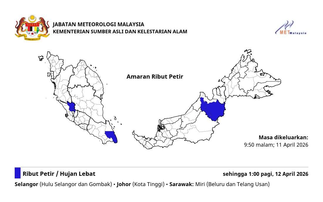 SHAH ALAM, 11 APRIL: Jabatan Meteorologi Malaysia (MetMalaysia) mengeluarkan amaran ribut petir dan hujan lebat di beberapa kawasan sehingga jam 1 pagi.
