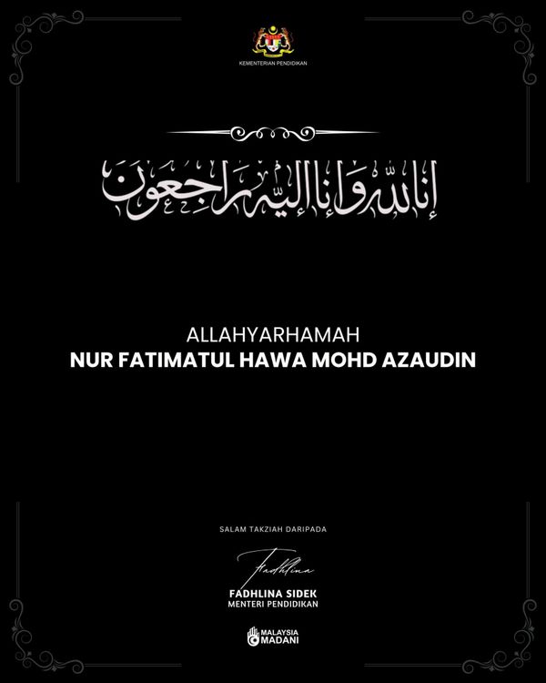 Pada masa sama, kementerian menzahirkan ucapan takziah kepada keluarga Allahyarhamah Nur Fatimatul Hawa Mohd Azaudin serta berharap mereka diberi kekuatan menghadapi ujian berkenaan.