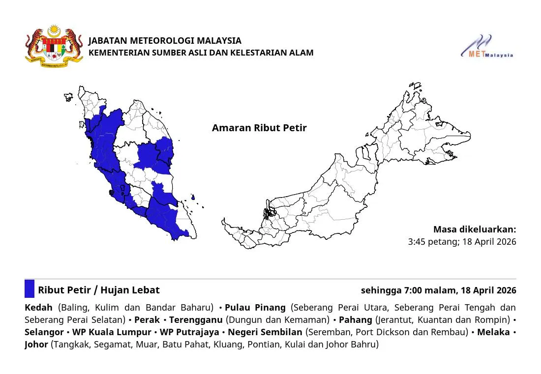 SHAH ALAM, 18 APRIL: Jabatan Meteorologi Malaysia (MetMalaysia) mengeluarkan amaran ribut petir, hujan lebat dan angin kencang di seluruh Selangor dan Kuala Lumpur hingga 7 malam.
