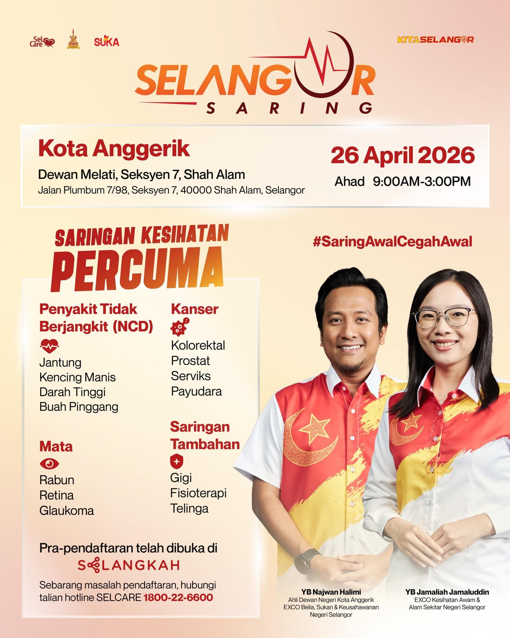 SHAH ALAM, 20 APRIL: Orang ramai berpeluang menjalani saringan kesihatan percuma menerusi program Selangor Saring di Dewan Melati, Seksyen 7, Shah Alam pada 26 April ini.