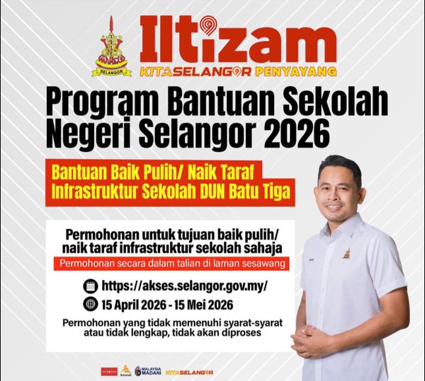 SHAH ALAM, 26 APRIL: Permohonan bantuan baik pulih dan naik taraf infrastruktur sekolah di kawasan Dewan Undangan Negeri (DUN) Batu Tiga dibuka bermula 15 April hingga 15 Mei ini.