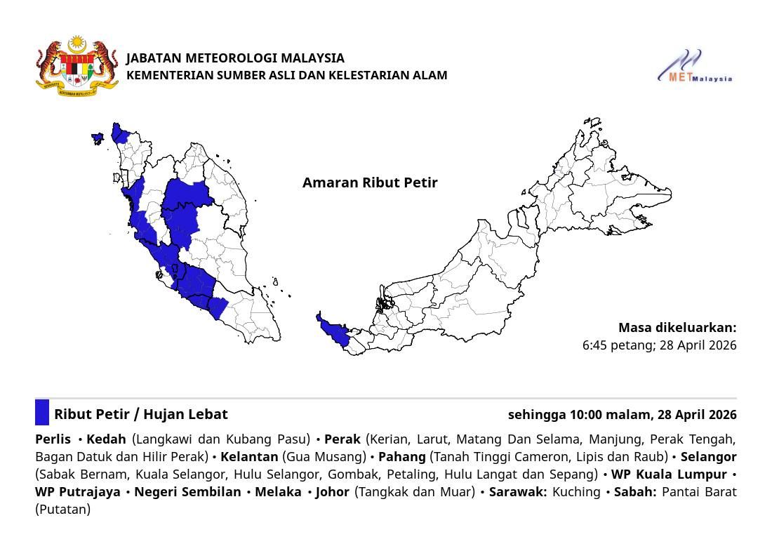 SHAH ALAM, 28 APRIL: Jabatan Meteorologi Malaysia (MetMalaysia) mengeluarkan amaran ribut petir melibatkan beberapa negeri di Semenanjung, Sabah dan Sarawak sehingga 10 malam ini.