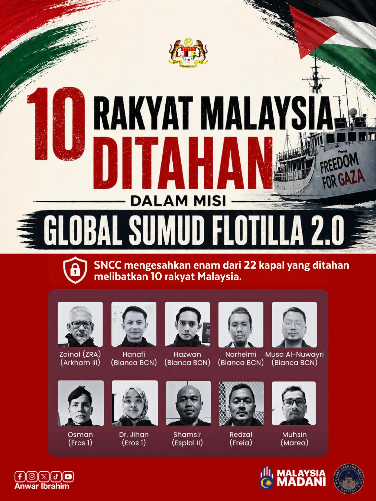“Kepada Allah SWT kita berserah, disulam dengan usaha menyeluruh yang sedang digerakkan, semoga kesemua mereka berada dalam keadaan selamat. Doa seluruh rakyat Malaysia mengiringi Global Sumud Flotilla. Hasbunallahu wa ni‘mal wakil,” ujarnya.