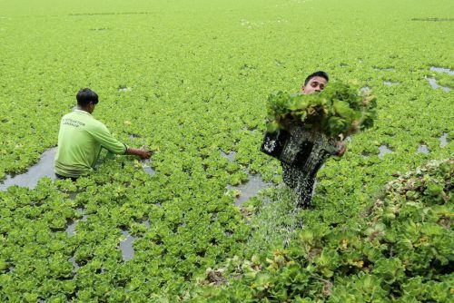 Pekerja kontraktor landskap Majlis Bandaraya Petaling Jaya (MBPJ) giat menjalankan kerja-kerja pembuangan pokok kiambang di Tasik Bandaran Kelana Jaya, Petaling Jaya pada 28 Februari 2023.