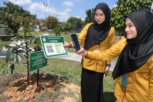 Puteri Nur Ain Noor Azman (kanan) bersama rakannya Nur Enafira Sazlin Noor Azahari mengimbas QR code E Pokok bagi mengenal jenis tanaman yang terdapat di Dusun Bandar Taman Kosas selepas Majlis Perasmian Dusun Bandar dan sambutan Hari Landskap Negara peringkat Majlis Perbandaran Ampang Jaya (MPAJ) 2023 di Ampang Jaya pada 29 Mac 2023.