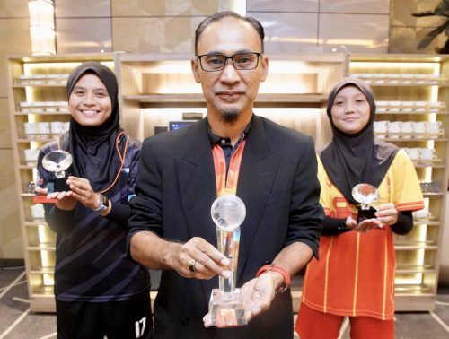 Jurulatih SSS Leopard Mohamad Zool Hilmy Mohd Yusof bersama dua pemainnya Nur Hafizatul Alya Yahya (kiri) dan Asma Munajati menunjukkan piala Liga Super Wanita FAS edisi 2021 yang dimenangi pasukan mereka pada Majlis Undian Liga Super Wanita FAS 2023 di Sunway Resort Hotel, Petaling Jaya pada 25 Januari 2023.