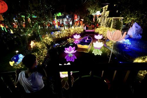 Pengunjung tertarik melihat sinaran cahaya tanglung yang menghiasi persekitaran kuil sempena perasmian Festival Tanglung dan Bunga 2023 bagi menyambut perayaan Tahun Baru Cina di Rumah Ibadat Fo Guang Shan Dong Zhen, Jenjarom pada 19 Januari 2023.
