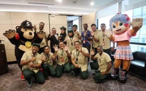 Kakitangan Paya Indah Wetlands bergambar bersama maskot orang utan dan beruang matahari yang diperkenalkan dalam Majlis Menandatangani Perjanjian Operasi dan Pengurusan Tanah Rizab Paya Indah Wetlands (PIW) di Kementerian Sumber Asli dan Kelestarian Alam, Putrajaya pada 3 Oktober 2024.