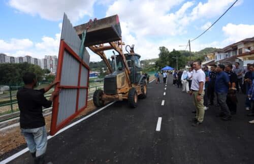 Ahli Dewan Negeri Kinrara Ng Sze Han melihat pekerja kontraktor mengalih penghadang jalan ketika meninjau kawasan yang siap dibaiki akibat tanah runtuh di Jalan Wawasan 3/9, Taman Wawasan, Subang Jaya pada 1 November 2024.
