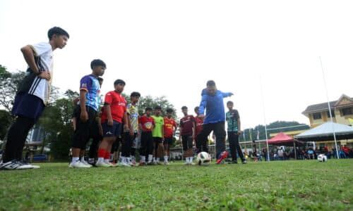 Bekas pemain bola sepak kebangsaan Safee Sali memberi tunjuk ajar kepada pelajar sekolah yang menyertai Super Safee Soccer School dan Klinik Asas Bola Sepak di Sekolah Menengah Kebangsaan Taman Melawati, Ampang Jaya pada 10 November 2024.