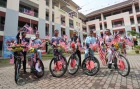 Pelajar Sekolah Menengah Kebangsaan (SMK) Saujana Impian menghias Jalur Gemilang pada basikal mereka sempena pelancaran bulan kebangsaan dalam majlis perasmian Kempen Kajang Bersih Kajang di Hatiku di SMK Saujana Impian, Kajang pada 12 Ogos 2024.