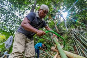 Hassan Ruak, 56, (hadapan) dibantu anak tunggalnya Adam Hassan, 20, memotong buluh mengikut sukatan ukuran lemang di kawasan hutan Kampung Sungai Congkak, Hulu Langat pada 14 Mac 2025.