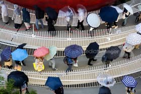 Pengunjung beratur dan berpayung dalam keadaan hujan untuk memasuki pameran di pavilion ketika tinjauan sekitar Ekspo Dunia Osaka 2025, Jepun pada 8 Mei 2025.