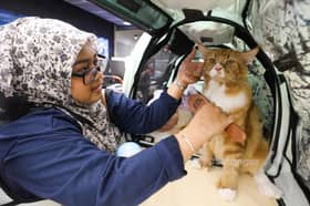 Peserta Fatin Nur Amanina Munef sedang menggayakan Miko, kucing peliharaannya, yang juga baka Maine Coon Polydactyl berusia 11 bulan sebelum pertandingan ketika program Royal Canin X MBPJ X KMU Cat Show 2025 di pusat beli-belah IPC, Petaling Jaya pada 15 Jun 2025.