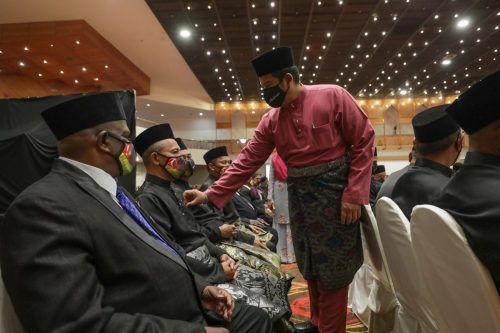 Petugas Protokol Istana Selangor membetulkan pin pada baju penerima sebelum Istiadat Pengurniaan Pingat-Pingat Negeri Selangor Darul Ehsan Bagi Penerima-Penerima Daerah Hulu Selangor, Gombak, Hulu Langat, Kuala Langat, Kuala Selangor, Sabak Bernam dan Sepang sempena sambutan Ulang Tahun Keputeraan Duli Yang Maha Mulia (DYMM) Sultan Selangor Sultan Sharafuddin Idris Shah Alhaj ke-76 di Dewan Jubli Perak Sultan Abdul Aziz Shah, Shah Alam pada 22 September 2022.