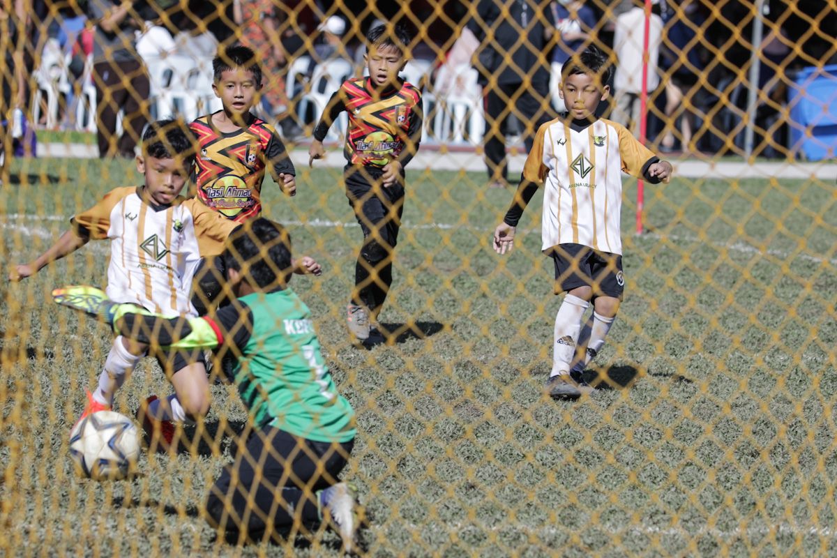 Aksi kanak-kanak dalam pertandingan bola sepak bawah lapan tahun yang diadakan ketika Jelajah Selangor Penyayang di padang Taman Kosas, Ampang pada 19 Jun 2022.
