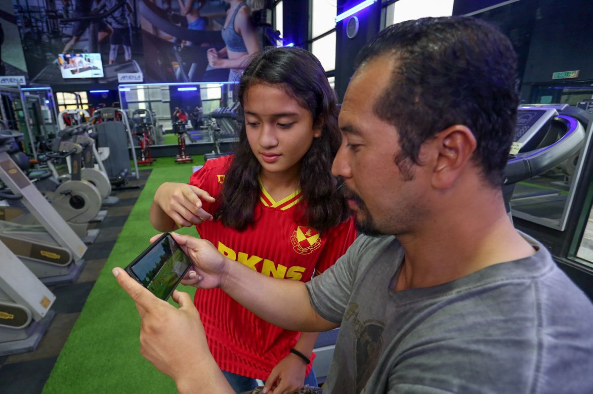 Khairul Najib Ibrahim dan anaknya, Qaseh Rania, 12, melihat rakaman video ketika sesi latihan bersama Kelab NK Osijek FC selama dua minggu di Croatia ketika diwawancara Media Selangor di Puchong pada 15 Jun 2022.