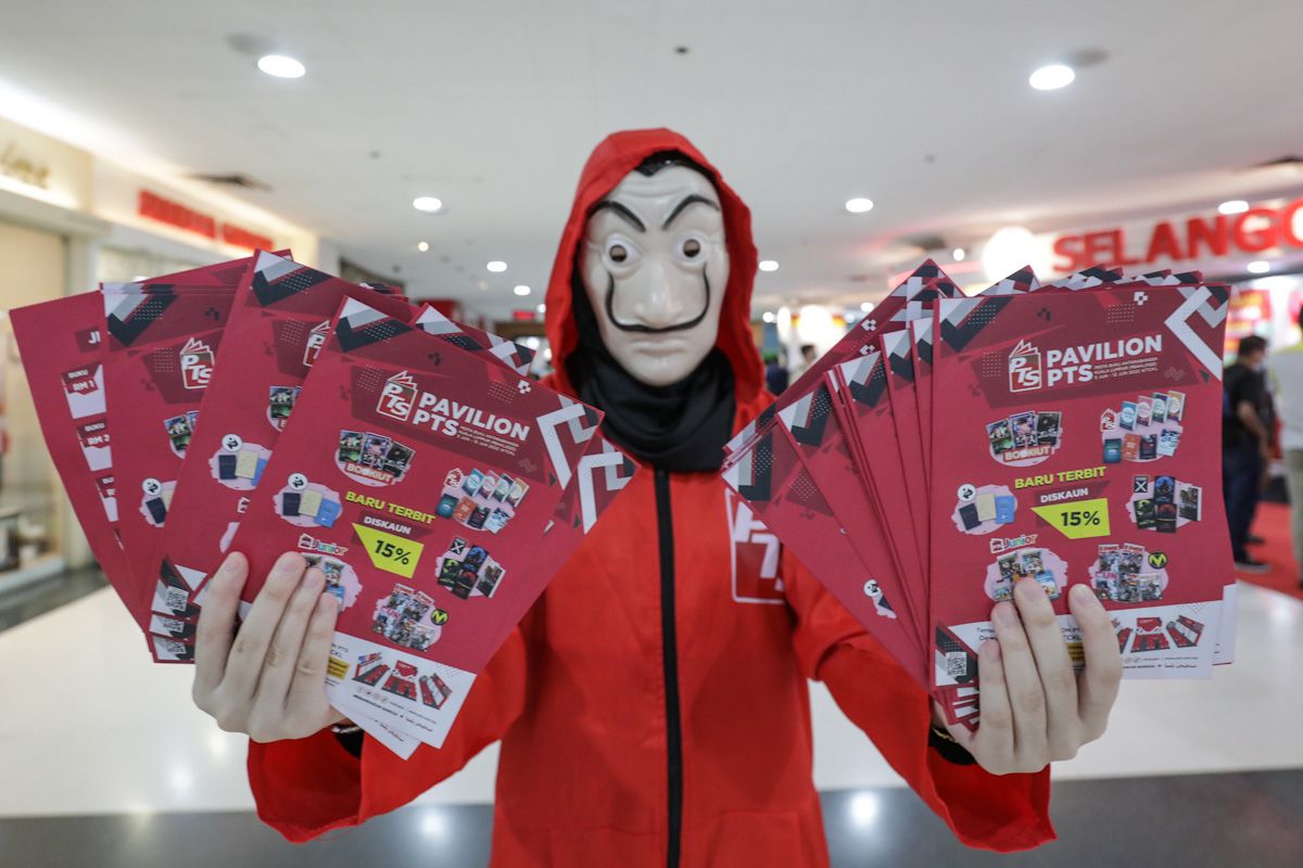 Pempamer Pemasaran PTS, Aisyah Hamdan, 18 yang dilihat memakai kostum dari siri popular Money Heist menunjukkan risalah untuk di berikan kepada pengunjung Pesta Buku Antarabangsa Kuala Lumpur 2022 di Pusat Dagangan Dunia Kuala Lumpur pada 3 Jun 2022.