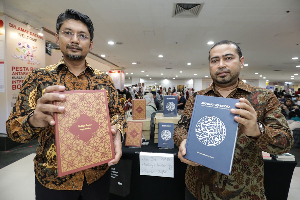 Farhan Affandi (kanan) dan Al-Mustaqeem Mahmod Radhi bersama terjemahan buku judul Abu Bakr as-Siddiq:Liku-liku hayat dan pemerintahan khalifah dan buku Mahligai Impian (terjemahan karya Naguib Mahfouz) ketika Pesta Buku Antarabangsa Kuala Lumpur di Pusat Dagangan Dunia Kuala Lumpur pada 6 Jun 2022.