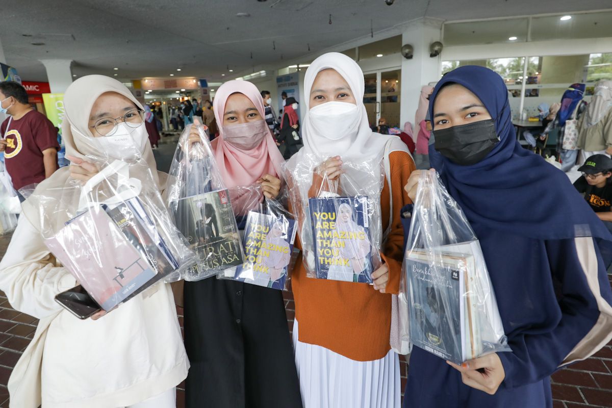 Pelajar Universiti Islam Antarabangsa Gombak menunjukkan buku yang mereka beli pada Pesta Buku Antarabangsa Kuala Lumpur di Pusat Dagangan Dunia Kuala Lumpur pada 6 Jun 2022.