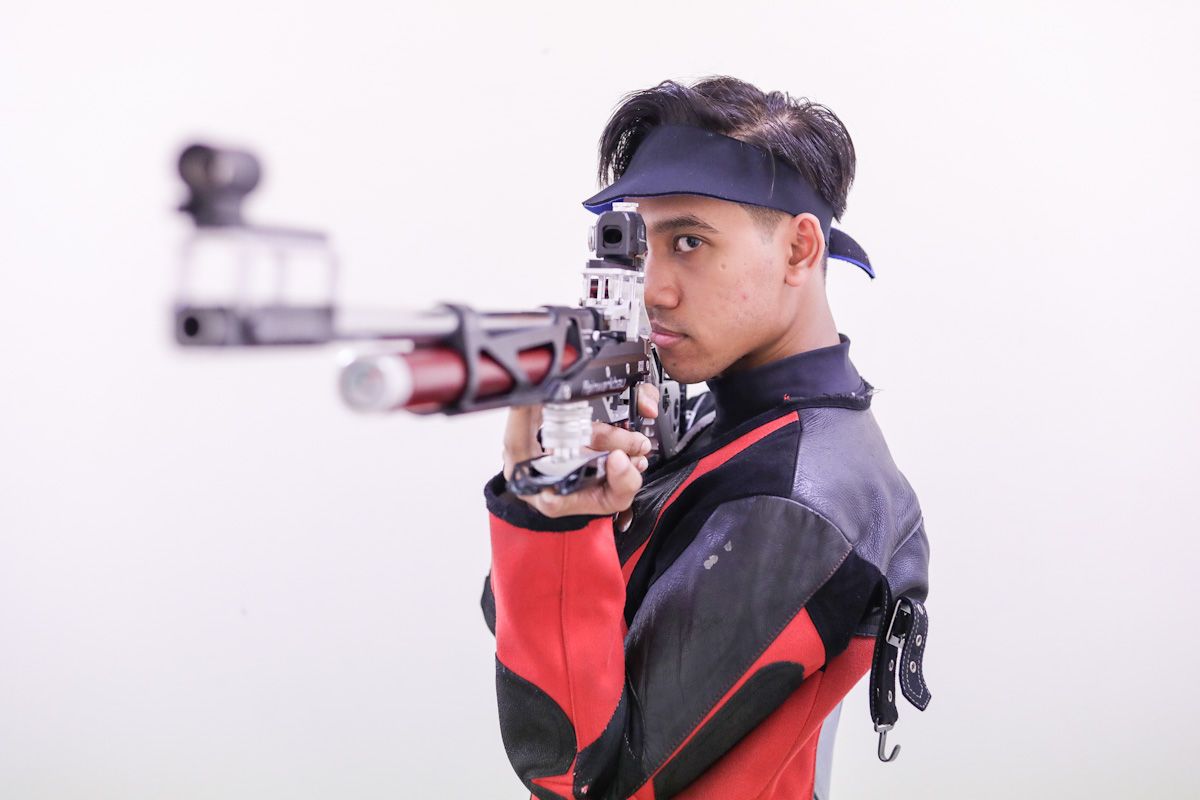 Atlet menembak Selangor, Muhammad Syukri Zulkifli ketika sesi latihan di Lapang Sasar Kelab Menembak Subang, Petaling Jaya pada 7 Jun 2022.