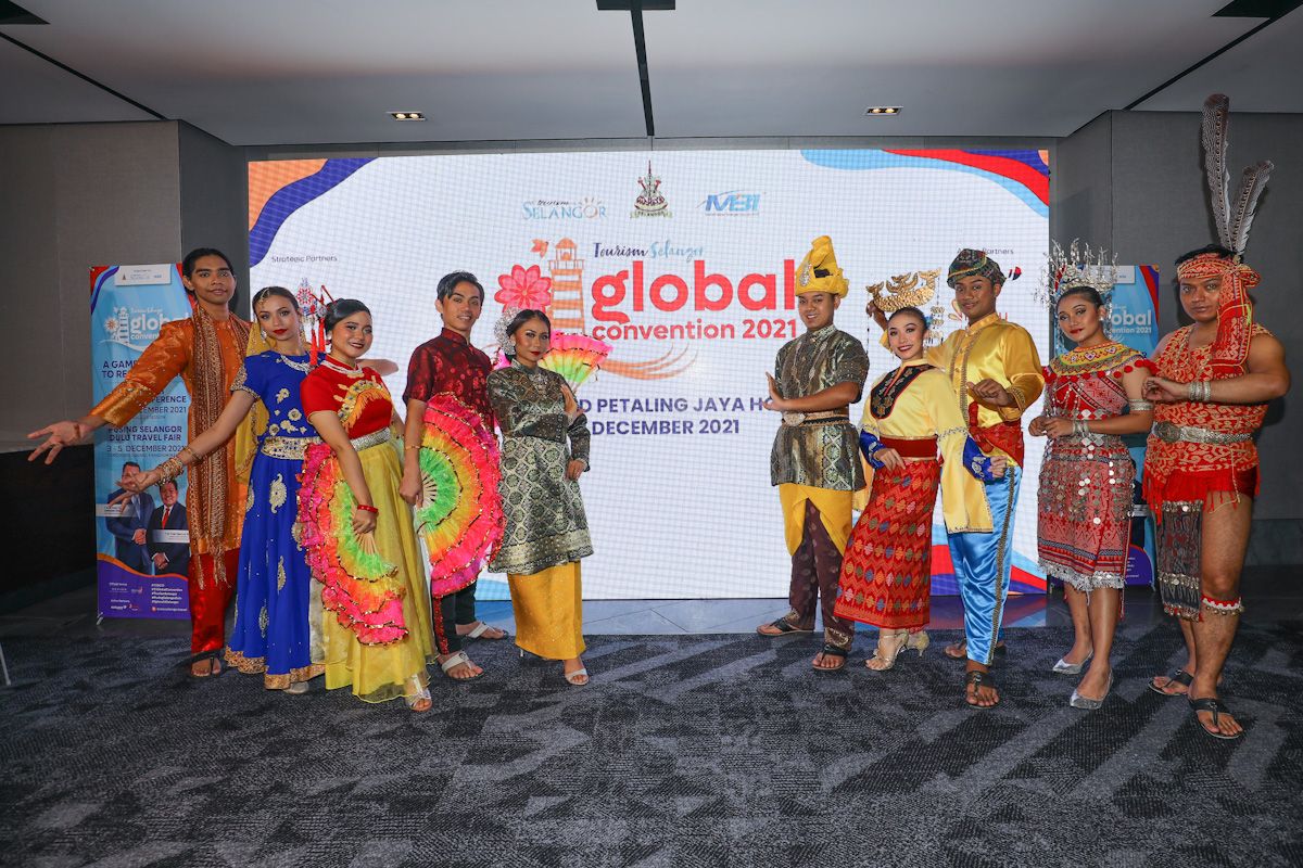 Penari memperagakan pakaian tradisional Malaysia ketika majlis Pelancaran Tourism Selangor Global Convention di Hotel New World Petaling Jaya pada 10 Disember 2021.