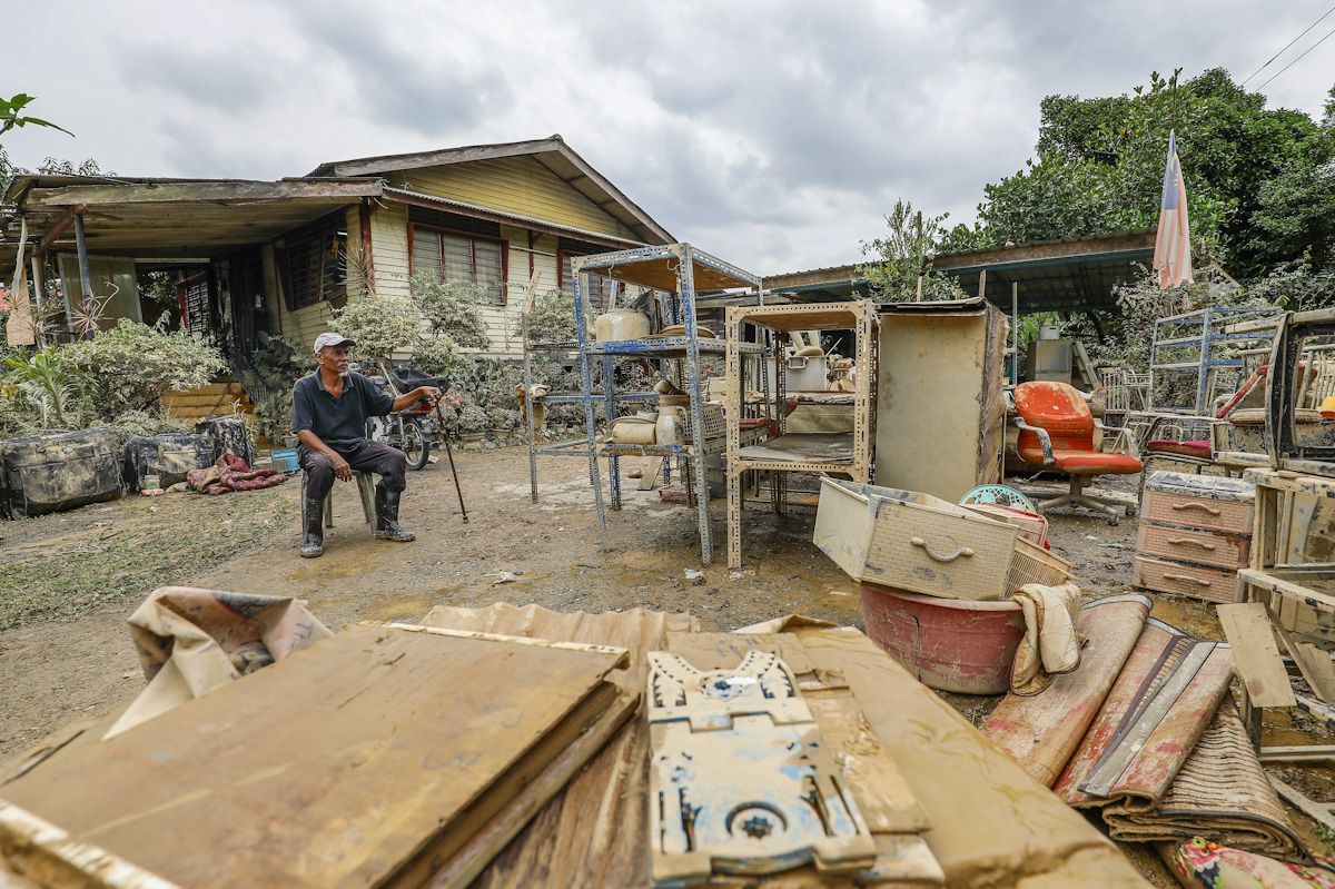 Roslan Abd Manan, 71, melihat barangan isi rumahnya yang rosak dan berlumpur ketika tinjauan keadaan selepas banjir di Batu 11, Kampung Sungai Serai, Hulu Langat pada 22 Disember 2021.