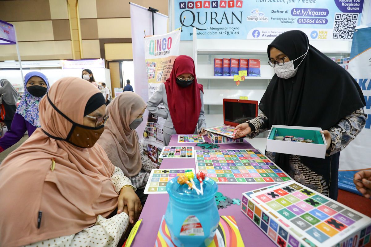 Pempamer, Khoirun Nisya Ruslan, 23, (kanan) menerangkan permainan Qingo kepada pengunjung di gerai pameran Akademi Sinergi Iklas ketika Pesta Buku Selangor di Pusat Konvensyen Shah Alam pada 11 Disember 2021.