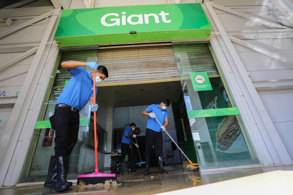 Kerja pembersihan sedang dilakukan ketika tinjauan keadaan selepas banjir di Pasaraya Giant, Seksyen 13, Shah Alam pada 21 Disember 2021.