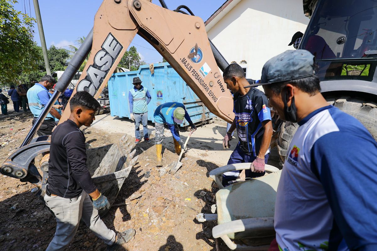 Kerja pembersihan pasca banjir oleh Jabatan Landskap Majlis Perbandaran Sepang (MPSepang) bersama Petugas KDEB Waste Management (KDEBWM) menggunakan jentera dan lori Roro di Kampung Cemperai, Dengkil pada 28 Disember 2021.