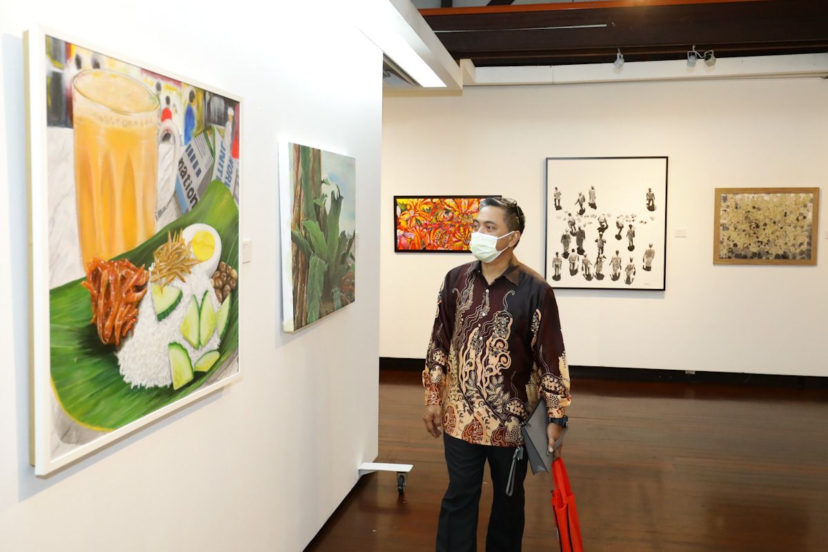 Pengunjung melihat karya peserta ketika majlis Perasmian Pameran Terbuka Galeri Shah Alam pada 9 Disember 2021.