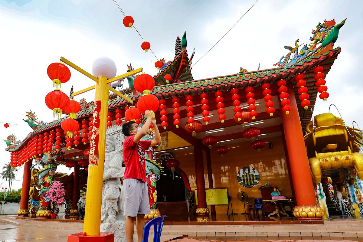 Seorang sukarelawan memeriksa tanglung yang di gantung sekitar kawasan tokong bagi persiapan perayaan Tahun Baharu Cina yang bakal disambut di Tokong Nam Yin Tong, Sasaran, Sg buloh pada 22 Januari 2022.