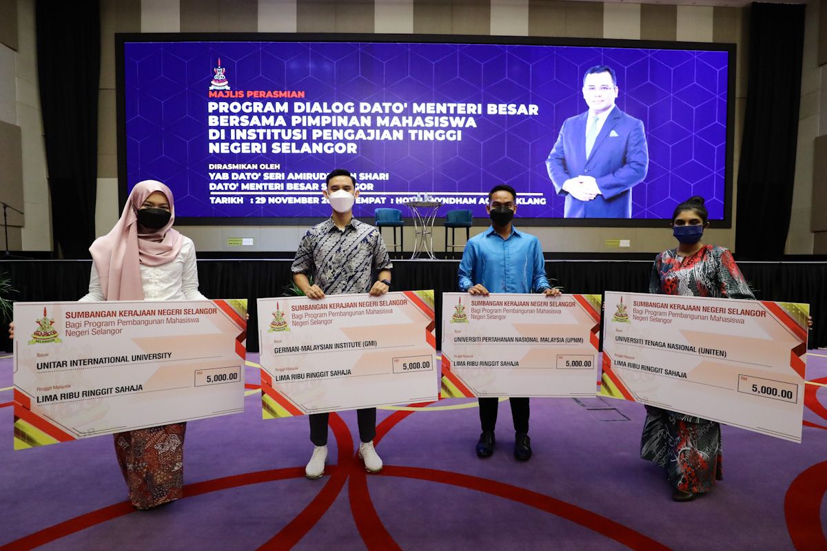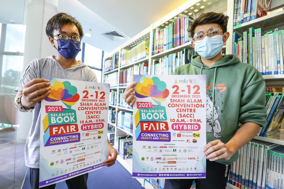 Pengunjung, Farhan Ibrahim, 17, (kanan) bersama Mohamad Luqman Abid Mohamad Imran, 17, menunjukkan poster Pesta Buku Selangor yang akan berlangsung pada 2 hingga 12 Disember di Pusat Konvensyen Shah Alam ketika tinjauan SelangorKini di Pustaka Raja Tun Uda, Shah Alam pada 28 November 2021.