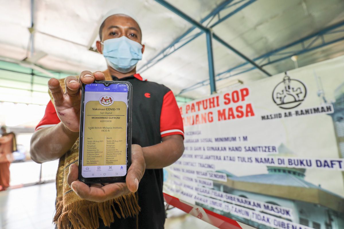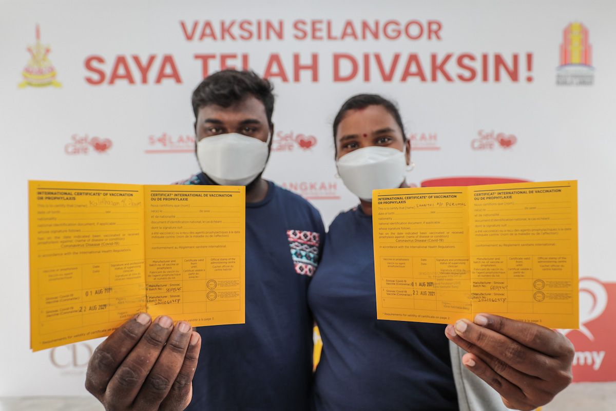 D Kalithasan,25, bersama isteri, P Shanthi,26, menunjukkan sijil lengkap dua vaksin selepas selesai menerima vaksin Covid-19 ketika program Vaksin Selangor (Selvax) di Pusat Pemberian Vaksin (PPV) Dewan MPKL Taman Banting Baru, Kuala Langat pada 22 Ogos 2021.