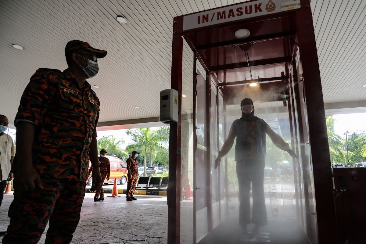 Pengunjung mencuba kotak nyahkuman bergerak ketika kerja sanitasi oleh Jabatan Bomba dan Penyelamat Negeri Selangor di Anggerik Mall, UTC Shah Alam pada 27 Oktober 2020.