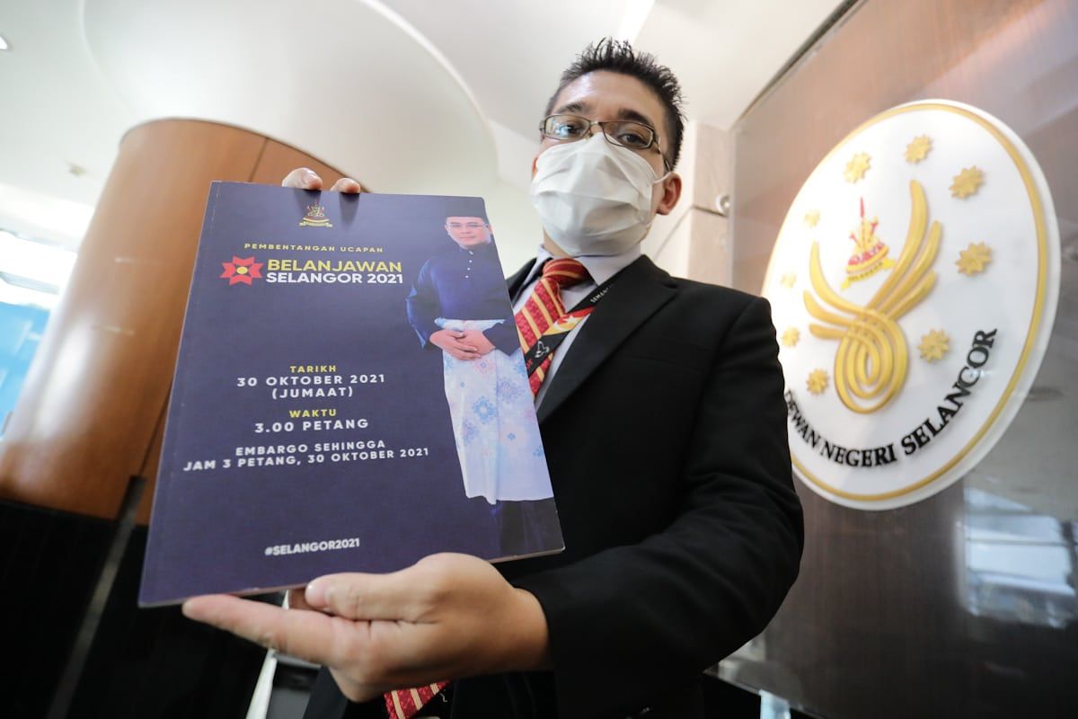 Kakitangan Kerajaan Negeri, Ahmad Fadhli Yahya menunjukkan buku Belanjawan Selangor 2021 selepas ucapan pembentangan oleh Dato' Menteri Besar, Dato' Seri Amirudin Shari di di Dewan Negeri Selangor pada 30 Oktober 2020.