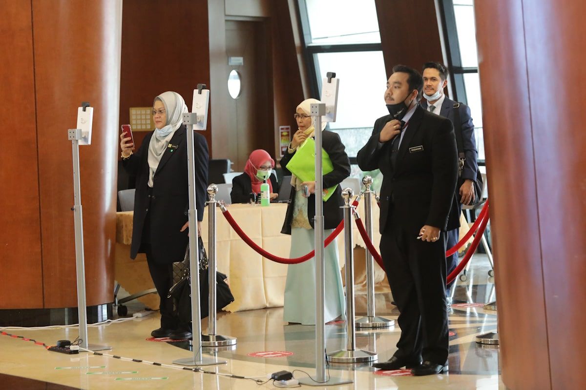 Petugas Dewan menggunakan alat imbasan muka dan pemeriksaan suhu badan sebelum memasuki dewan persidangan Negeri Selangor, Shah Alam pada 3 November 2020.