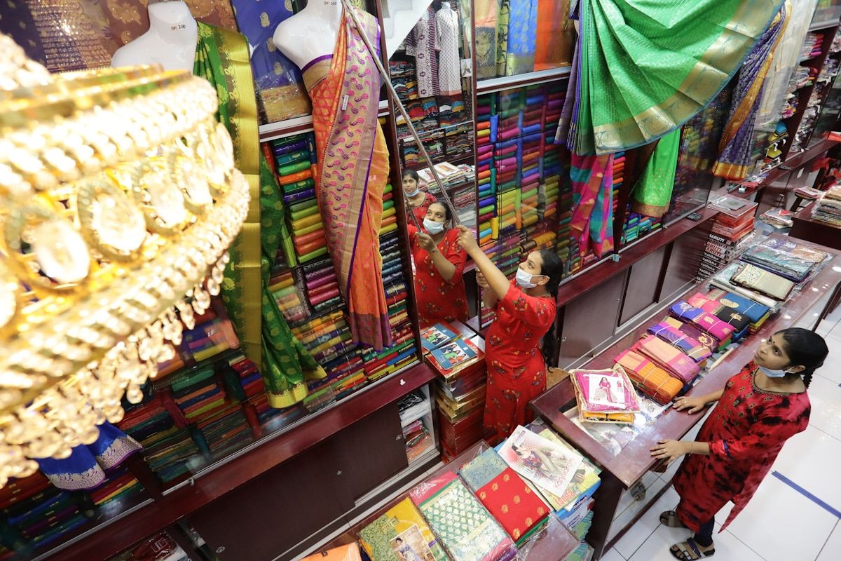 Jurujual pakaian Jayachandran Textile Sdn Bhd, Divya Puspanathan, 23, menggantung kain sari sambil diperhatikan rakan sekerja, Kirtana Shenthilnathan, 21, di Jalan Tengku Kelana, Klang pada 5 November 2020.