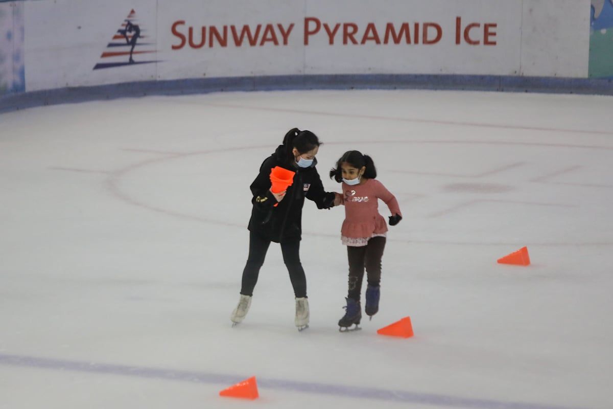Jurulatih sedang mengajar seorang kanak-kanak meluncur di gelanggang ais Sunway Pyramid, Subang Jaya ketika tinjauan SelangorKini pada 25 Disember 2020.