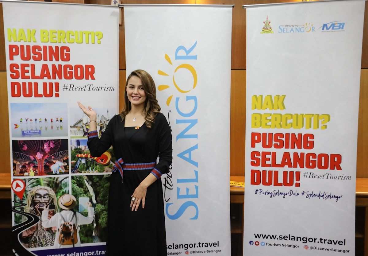 Duta Kempen, Che Puan Juliana Evans bersama gegantung promosi kempen ‘Pusing Selangor Dulu’ di Bilik Mesyuarat MTES, Bangunan Sultan Salahudin Abdul Aziz Shah pada 17 Disember 2020.