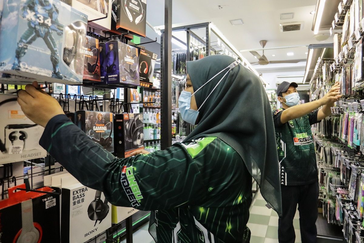Pekerja kedai aksesori telefon bimbit menyusun barang jualan ketika kunjungan program Lawatan Kembara Sukses Hijrah di Cikgu Gadget, Sungai Besar pada 21 Disember 2020.