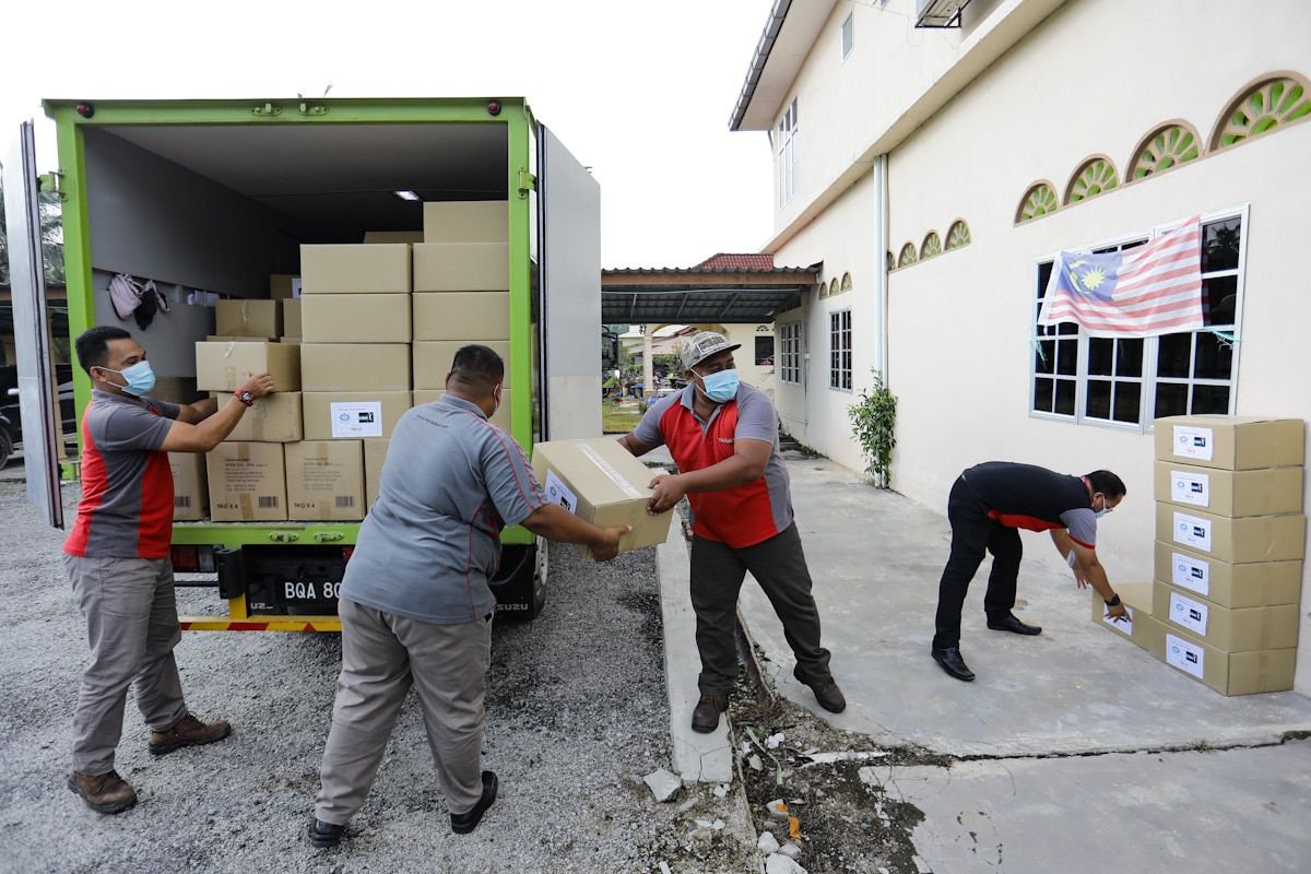 Barangan bantuan makanan kering dan persekolahan kepada penghuni rumah pemulihan riqab tiba di Madrasah Darul Islah Sungai Serdang, Klang pada 25 Disember 2020.