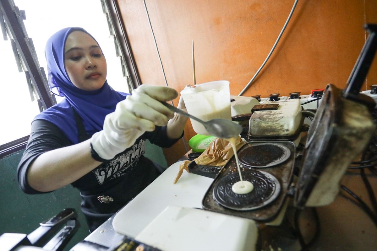 Noratiqah mahmud, 25 meletakkan bancuhan tepung ke acuan untuk memasak kuih kapit di Haq Rich Enterprise, Tanjung Karang ketika kunjungan lawatan Kembara Sukses Hijrah pada 21 Disember 2020.