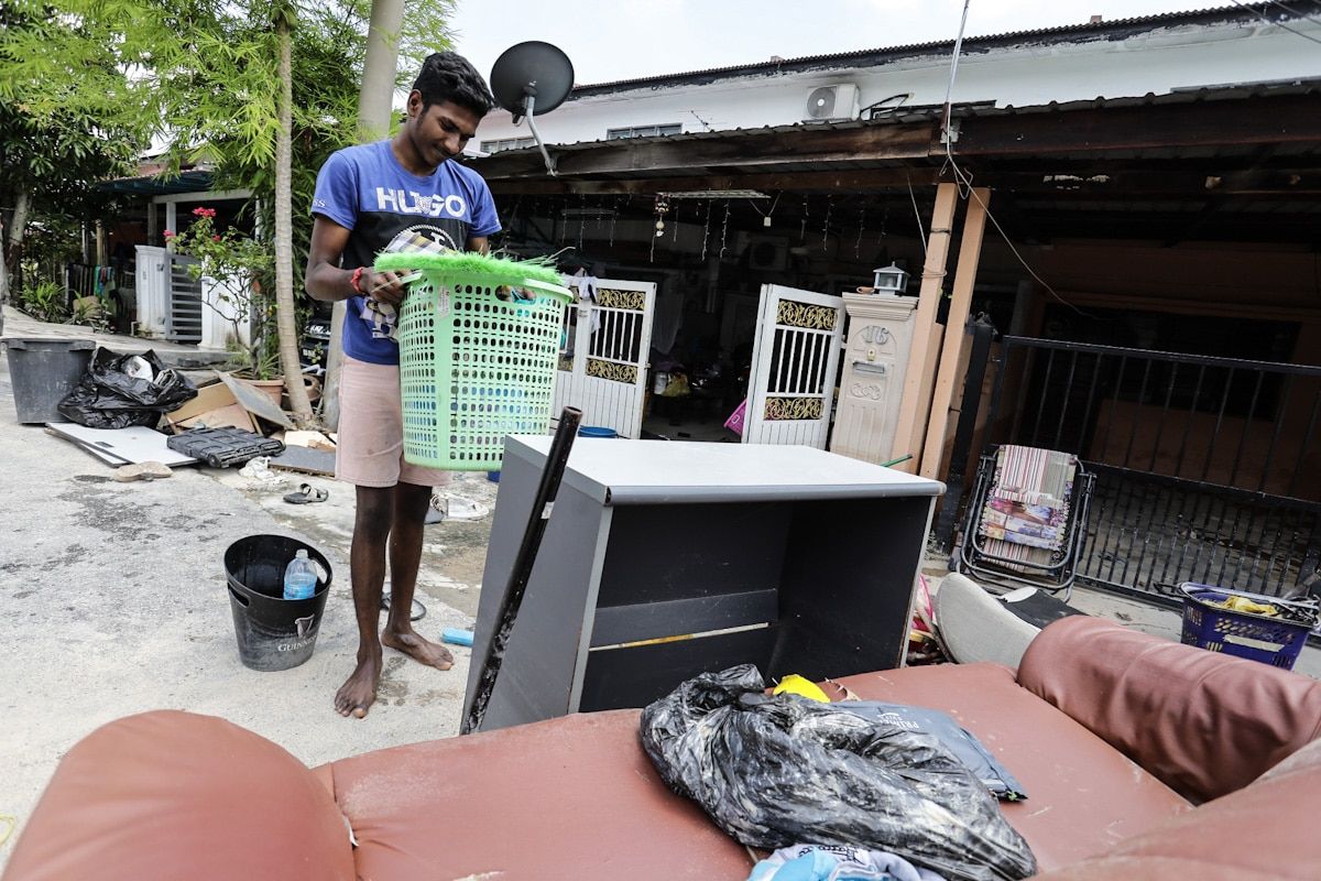 Shanmugam Rajaendran, 17 membersihkan barang keperluan rumah yang terselamat akibat dari banjir yang menimpa Taman Baiduri, Dengkil pada 20 Julai 2020.
