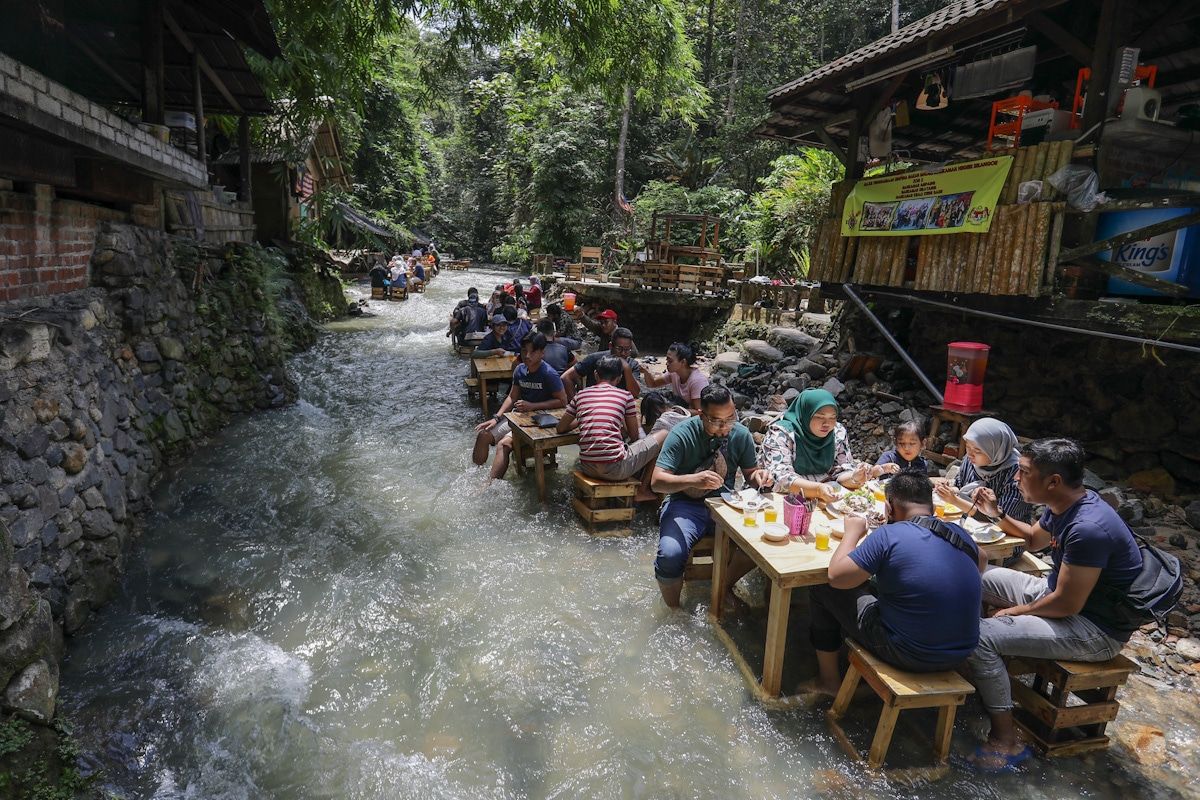 Pengunjung menikmati hidangan atas sungai dengan suasana alam semula jadi di BBQ Lamb KL Kemensah, Ampang pada 27 Julai 2020.