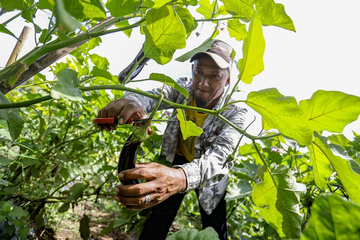 Peserta Program Hijrah, Maslan Rahmat, 45 memetik terung di kebunnya di Kampung Parit 7, Sungai Panjang, Sabak Bernam pada 23 Julai 2020.