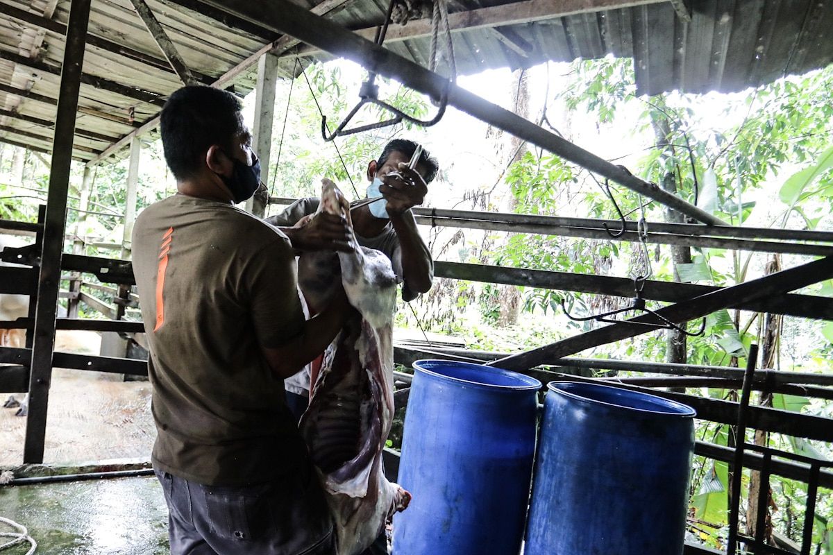 Penduduk kampung mengangkat daging kambing qurban untuk digantung bagi memudahkan kerja melapah di Kampung Sungai Pusu, Gombak pada 31 Julai 2020.