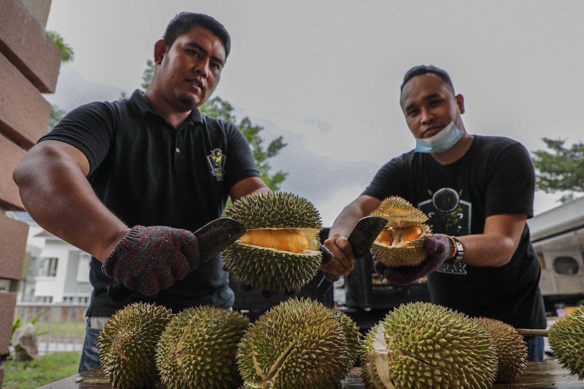 Peniaga Durian Seladang menunjukkan durian yang telah dibuka ketika Jom Makan Buah-Buahan Tempatan Bersama Kakitangan Media Selangor di Carlton Holiday Hotel & Suites, Shah Alam pada 24 Julai 2020.