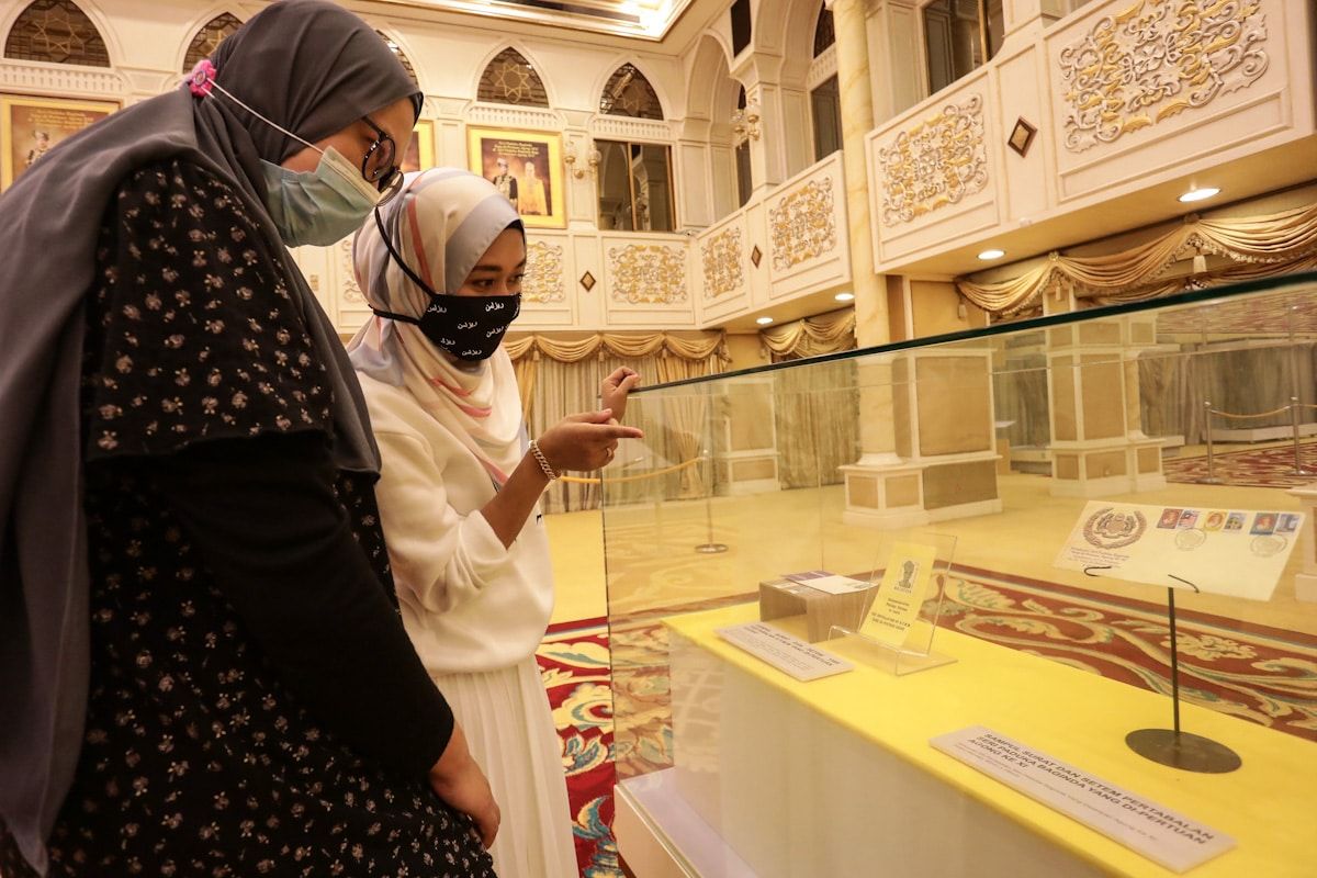 Pengunjung melihat sampul surat dan setem pertabalan Yang Di-Pertuan Agong Ke Sebelas, Al-Marhum Sultan Salahuddin Abdul Aziz Shah ibni Almarhum Sultan Hisamuddin Alam Shah Al-Haj di Muzium Diraja, Kuala Lumpur pada 22 Ogos 2020.